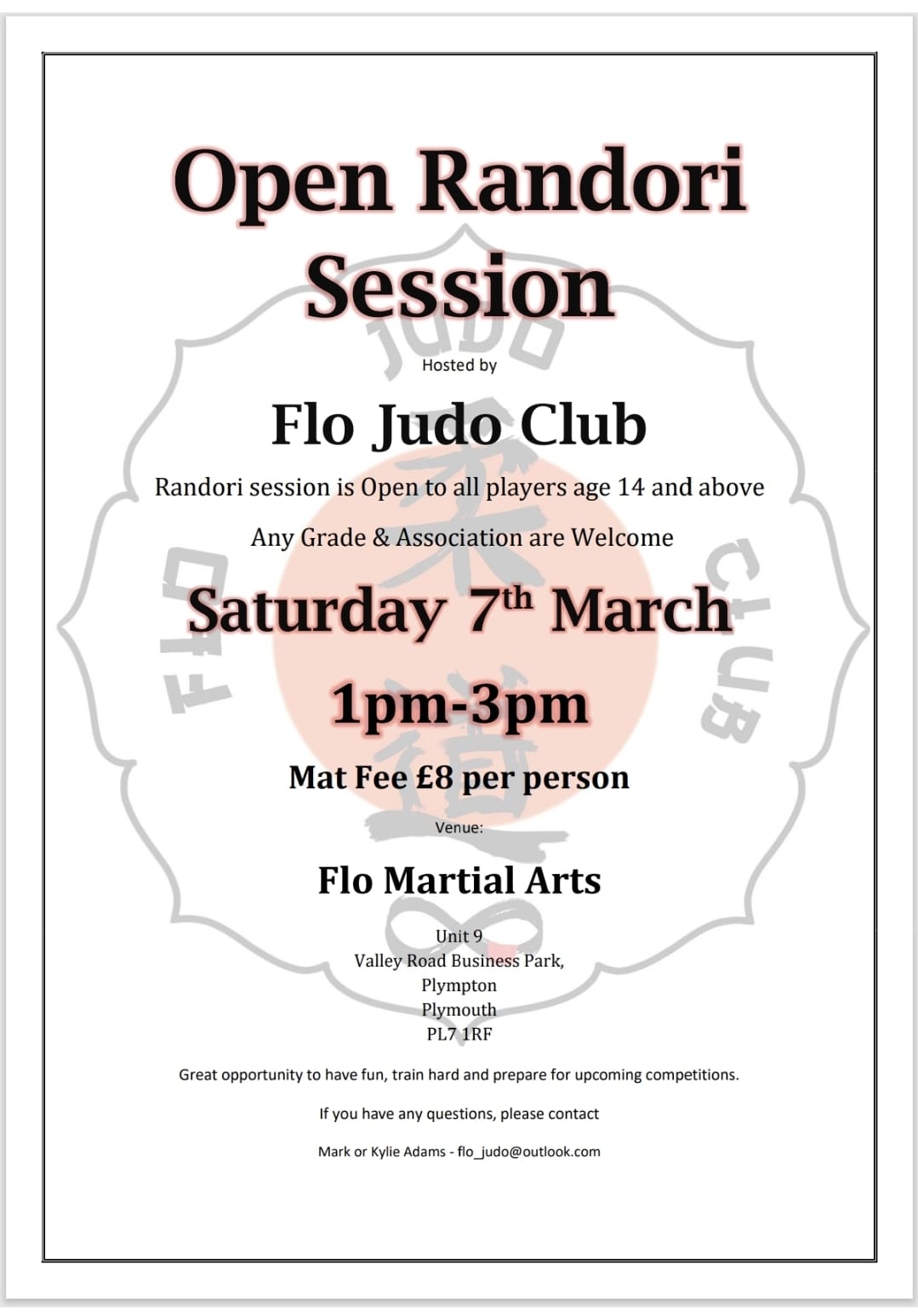 Open Randori – Flo Judo Club age 14 plus + Add to Google Calendar + iCal / Outlook export 00 days 00 hours 00 minutes 00 seconds Search: Recent Posts Congratulations Dave, 6th Dan and British Empire Medal (BEM) Future west stars! Kingsley school Reindeer Rumble Fun u8 Judo Festival What a year for Rowan Kinsella! Western Area Open mat randori November 2025 European Adaptive Champion 2025 Recent Comments